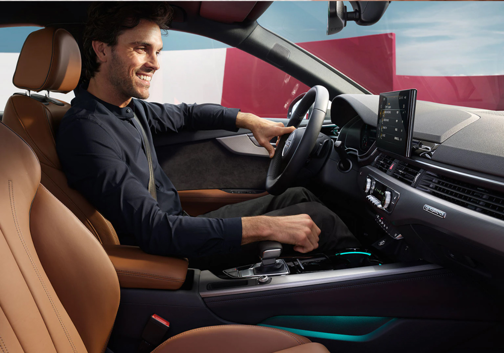 아우디 A4의 넓은 실내 공간에는 밝고 탁 트인 느낌을 극대화해주는 요소들이 전략적으로 배치되었습니다. 예를 들어, 수평으로 길게 이어진 송풍구는 차체의 너른 폭을 강조해주고, 그 위의 크롬 스트립은 고급스러운 느낌을 더해줍니다. 센터 콘솔은 넉넉한 수납 공간을 제공합니다.앰비언트 라이팅 패키지로 보다 다양한 분위기를 연출할 수 있습니다.