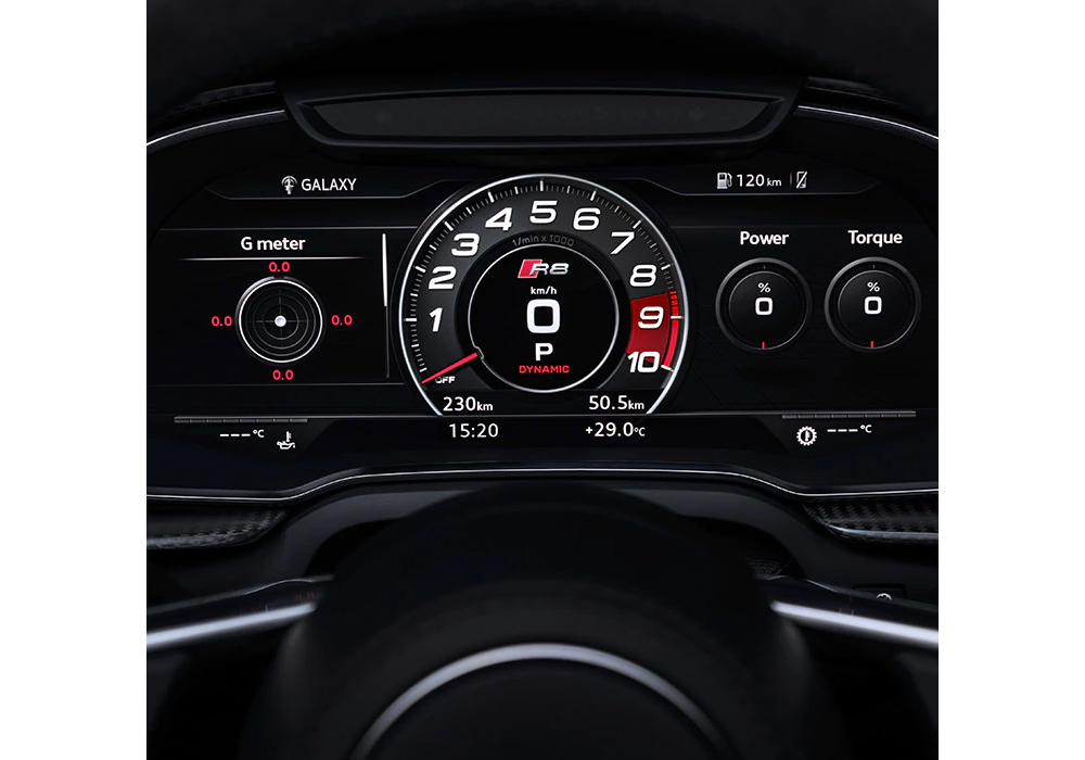 MMI 내비게이션 플러스와 아우디 버추얼 콕핏을 통해, 운전자는 운전대에서 손을 떼거나 도로에서 눈을 떼지 않고도 모든 기능을 쉽게 조작할 수 있습니다. 아우디 버추얼 콕핏의 12.3 인치 디스플레이에서 중점이 되는 요소는 회전계입니다. 이를 중심으로 토크, 중력, 랩 타임, 엔진 및 기어 오일 온도, 타이어 압력 및 온도 같은 여러 성능 수치를 한눈에 확인할 수 있습니다.