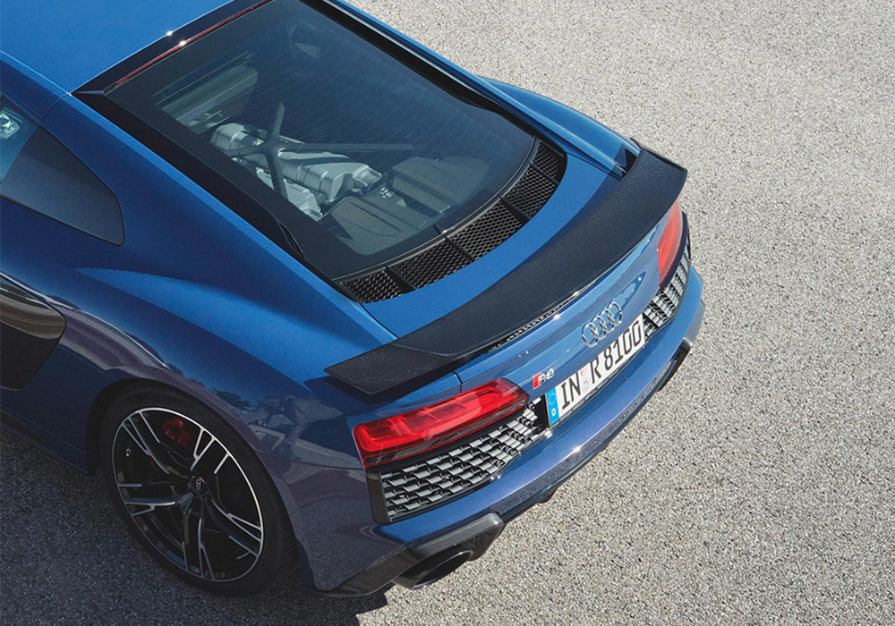 앞쪽으로 위치한 조수석, 도드라지게 강조된 휠 아치 및 스포티한 디퓨저가 아우디 R8 V10 퍼포먼스에서 특히 눈에 띄는 디자인 요소입니다. 후방에서는 전체 너비에 걸쳐진 공기 배출 그릴과 글로시 블랙의 새로운 타원형 배기 테일 파이프가 눈길을 끕니다. 이는 탄소 섬유 강화 플라스틱(CFRP)으로 만든 고정식 대형 스포일러로 더욱 강조되며, 측면은 탄소 섬유로 제작된 사이드 블레이드가 압도적인 인상을 구성합니다. 전방의 깊은 수평선들은 폭을 한층 더 넓게 보이게 만들어 주며, 차체를 더욱 낮고 스포티하게 보이는 효과를 줍니다.