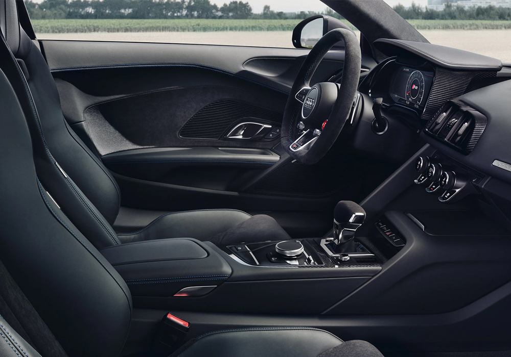 운전자 중심의 모노포스토 디자인을 반영하여, 넓게 굴곡진 아치를 사용해 모든 컨트롤을 운전자의 시야에 구성했습니다. 아우디 R8 V10 퍼포먼스에는 편안한 착좌감과 함께 강력한 측면 지지력을 제공하는 R8 전용 스포츠 시트가 장착되었습니다. 고급 나파 가죽 소재의 블랙 R8 스포츠 시트, 대비되는 색상의 다이아몬드 퀼팅 스티칭, 글로시 카본트윌 인레이는 아우디 R8 V10 퍼포먼스의 인테리어를 더욱 돋보이게 하는 요소입니다.