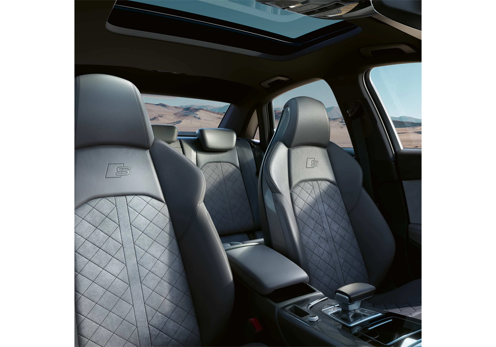 아우디 S4의 앞좌석 도어를 열면 S 엠블럼과 알루미늄 인레이가 들어간 도어 실 트림이 장착되어 있습니다. 다이아몬드 패턴의 스티칭과 S 로고가 새겨져 있는 프런트 스포츠 시트는 시트의 높이, 앞/뒤 위치, 시트 각도 및 등받이 각도를 전동으로 조정할 수 있습니다. 확장된 측면의 볼스터는 코너링 시 탑승자를 안정적으로 잡아줍니다. 촘촘하게 타공된 가죽으로 마감한 스티어링 휠은 S 엠블럼과 컨트래스트 스티치가 특징입니다.