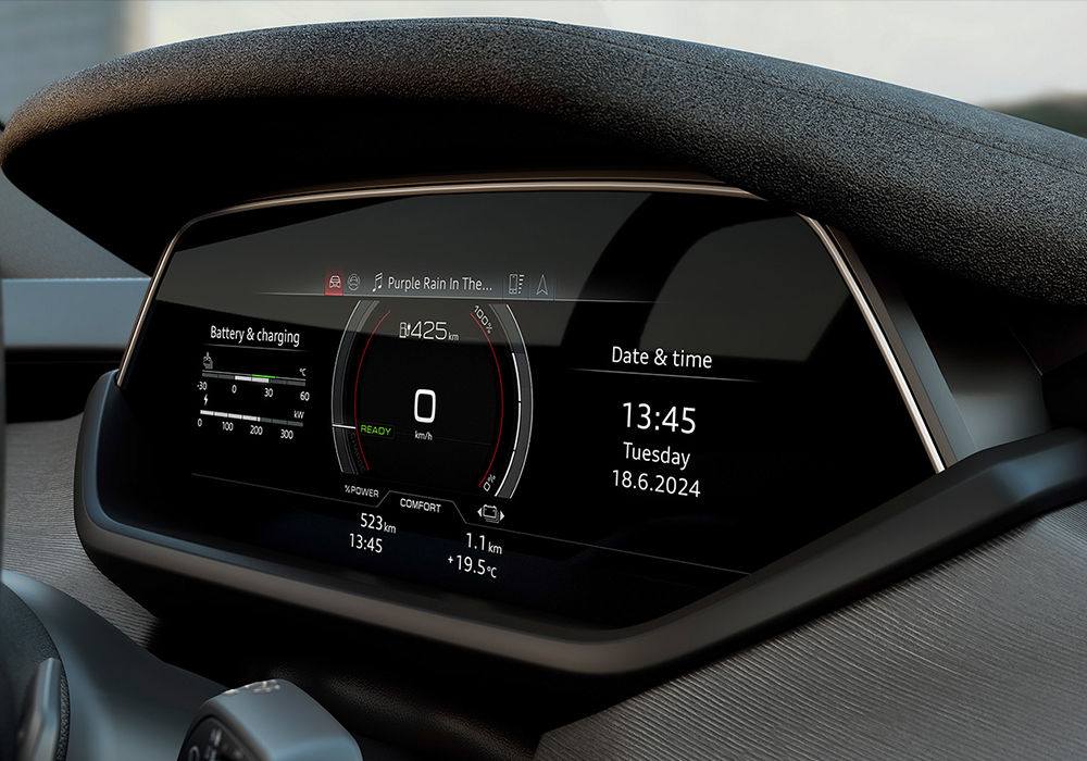 아우디 버추얼 콕핏 플러스의 12.3인치 디스플레이는 속도 및 내비게이션 안내뿐만 아니라 배터리 온도 및 현재 차량의 최대 허용 충전 용량 등 충전 프로세스 관련 정보도 표시해 줍니다.